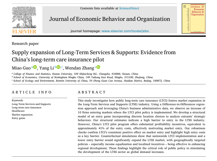 近日,男同av 保险精算系郭淼副教授合作的论文“Supply expansion of Long-Term Services & Supports: Evidence from China’s long-term care insurance pilot”在院定A2类期刊Journal of Economic Behavior and Organization,volume239,November 2025发表。