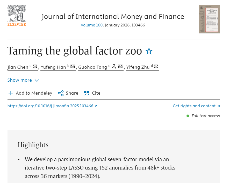 近日,男同av 金融科技与工程系唐国豪副教授合作的金融人工智能领域类论文“Taming the Global Factor Zoo”发表在《Journal of International Money and Finance》2026年第1期上。